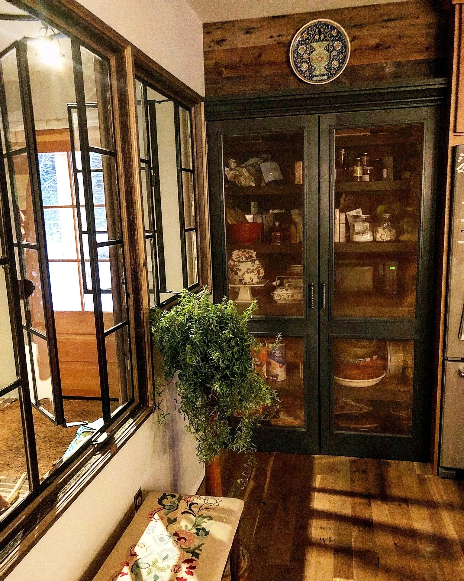 A kitchen corner with a large cabinet with glass doors, a potted plant, a window with black metal frames, and a wooden bench with a floral cushion.
